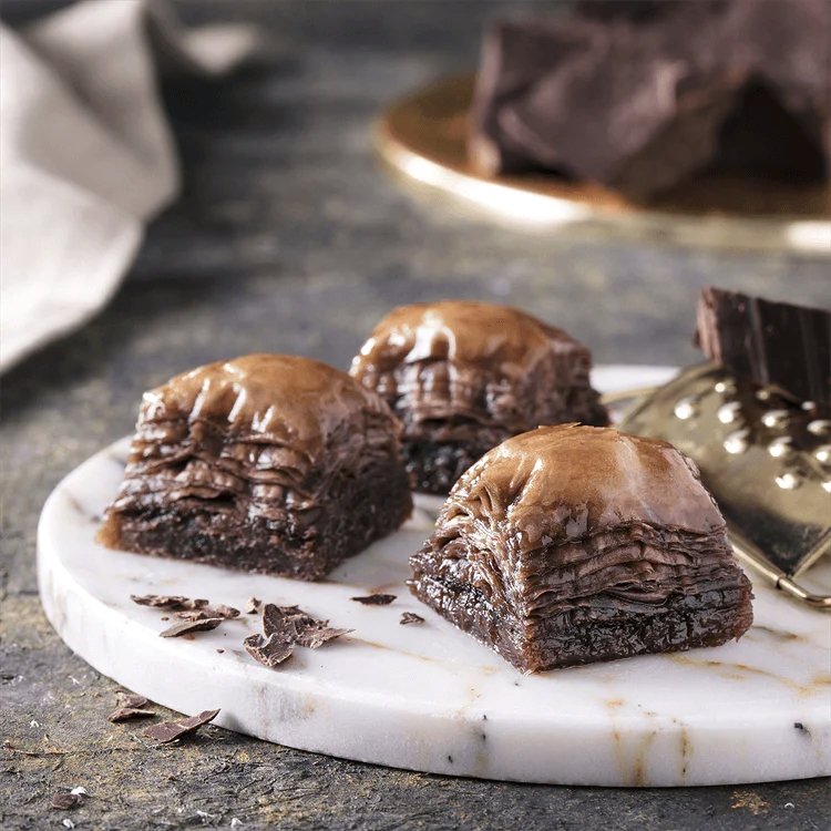 Chocolate Baklava is a special Middle Eastern baklava that is made of a special filo pastry dough that is composed of kneaded flour with a high concentrate of cacao. Layers and layers of sweet, crisp and buttery filo pastry dough and cacao are combined with the remaining ingredients, then baked in the oven. Finally, it is topped with a sweet syrup and placed back into the oven where it finishes baking all its sweet, chocolaty, crispy goodness.