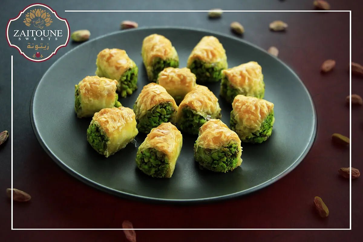 Kol & Shkor mit Honig von Zaitoune ist gefüllt mit türkischen Desserts, die aus süßen Teigwaren bestehen, die aus dünnen Schichten von Teig hergestellt und mit Pistazien gefüllt sind, und mit Honig gesüßt werden. Verpackt in einem Gehäuse aus Metall, das von einer Nylonhülle unterstützt wird, um das Produkt vor äußeren Einflüssen wie Feuchtigkeit zu schützen und seine Qualität und seinen Geschmack zu bewahren.